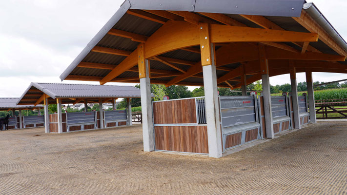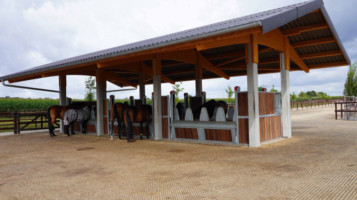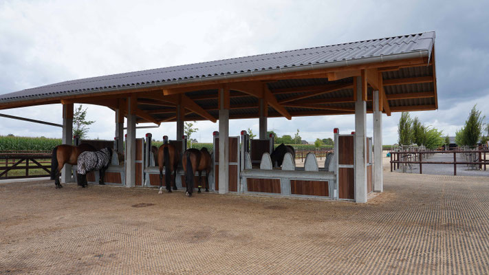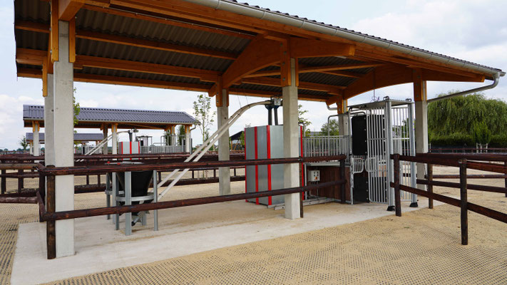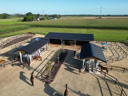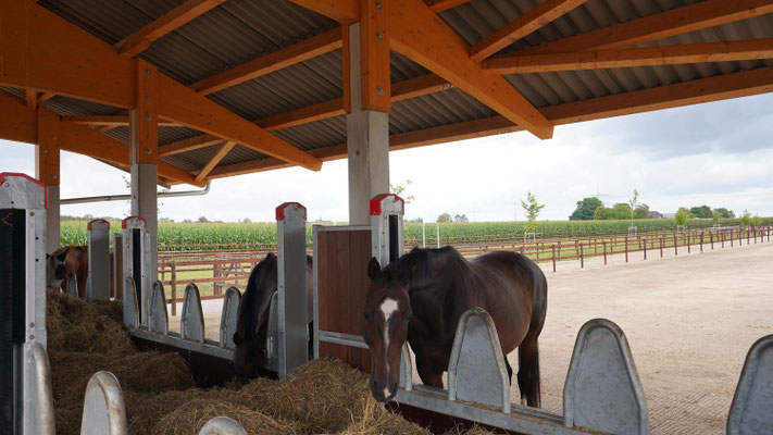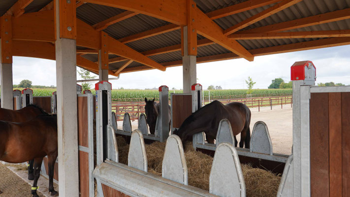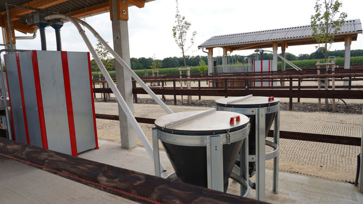 Dank innovativer Kraftfutterstationen wird jedes Pferd individuell versorgt. Ein intelligentes Transpondersystem erfasst die Tiere und steuert die Fütterung – das Futter gelangt automatisch aus leicht befüllbaren Silos in die Vorratsbehälter der Stationen. Nach der Futteraufnahme können die Pferde über Drei-Wege-Selektionen gezielt auf die Weide, in den Ad-libitum-Bereich oder zurück zur Gruppe geleitet werden.