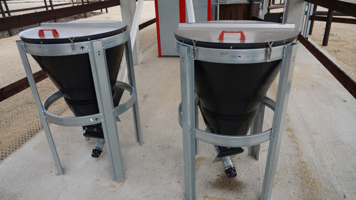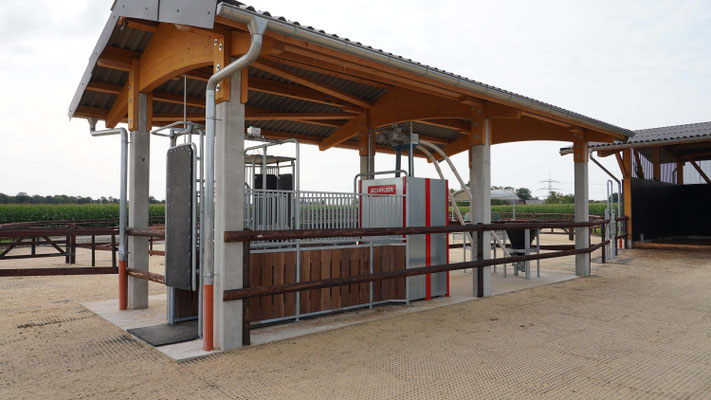 Die Raufutterversorgung erfolgt über den Schauer HeuTimer 2.0 mit 56 Fressplätzen pro Gruppe. Durch zeitgesteuertes Öffnen und Schließen der Heuraufen wird eine stressfreie Fütterung gewährleistet. Ergänzend dazu bietet eine beheizte Schwimmertränke optimale Wasserverfügbarkeit, während ChillOutBoxen Rückzugsmöglichkeiten schaffen.