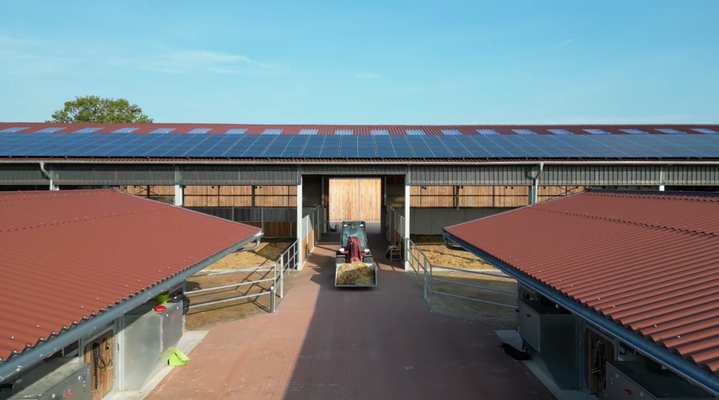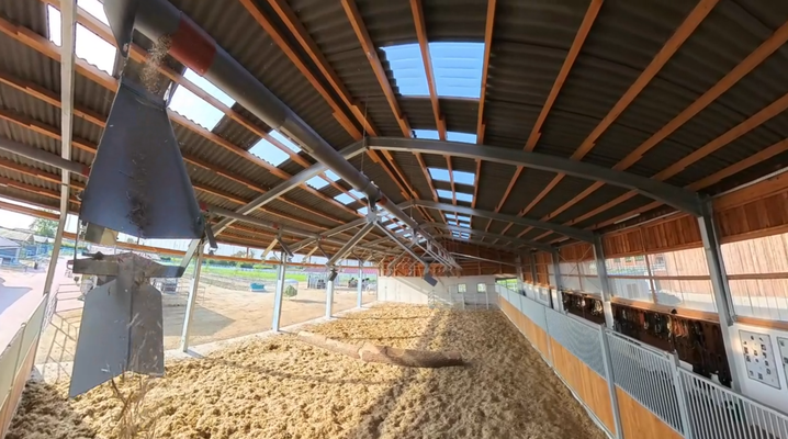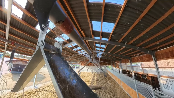 Die Strohmatic verarbeitet sowohl Rund- als auch Quaderballen zu entstaubtem, gehäckseltem Stroh und verteilt dieses vollautomatisch im Liegebereich. Maschinelle Entmistung und kurze Wege ermöglichen die Reinigung der über 7.000 m² großen Ausläufe in nur rund 50 Minuten pro Tag.
